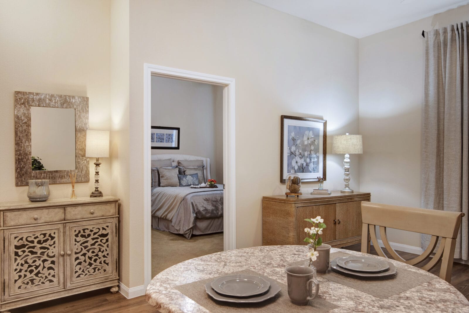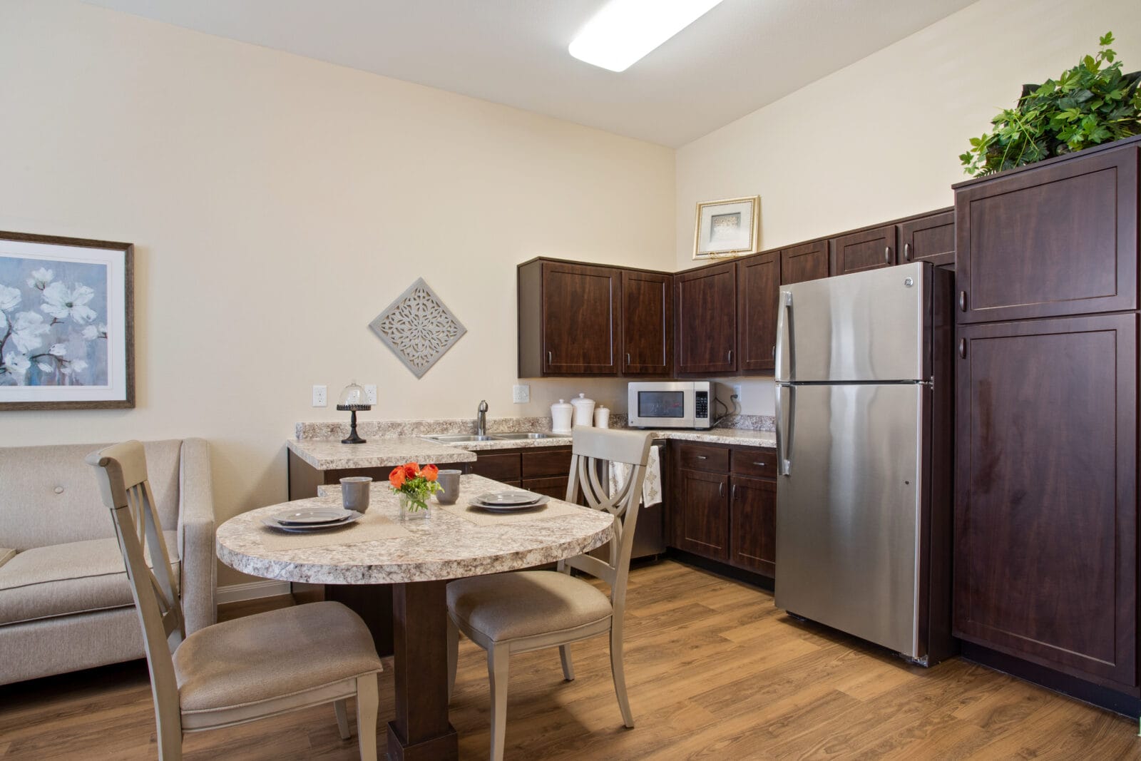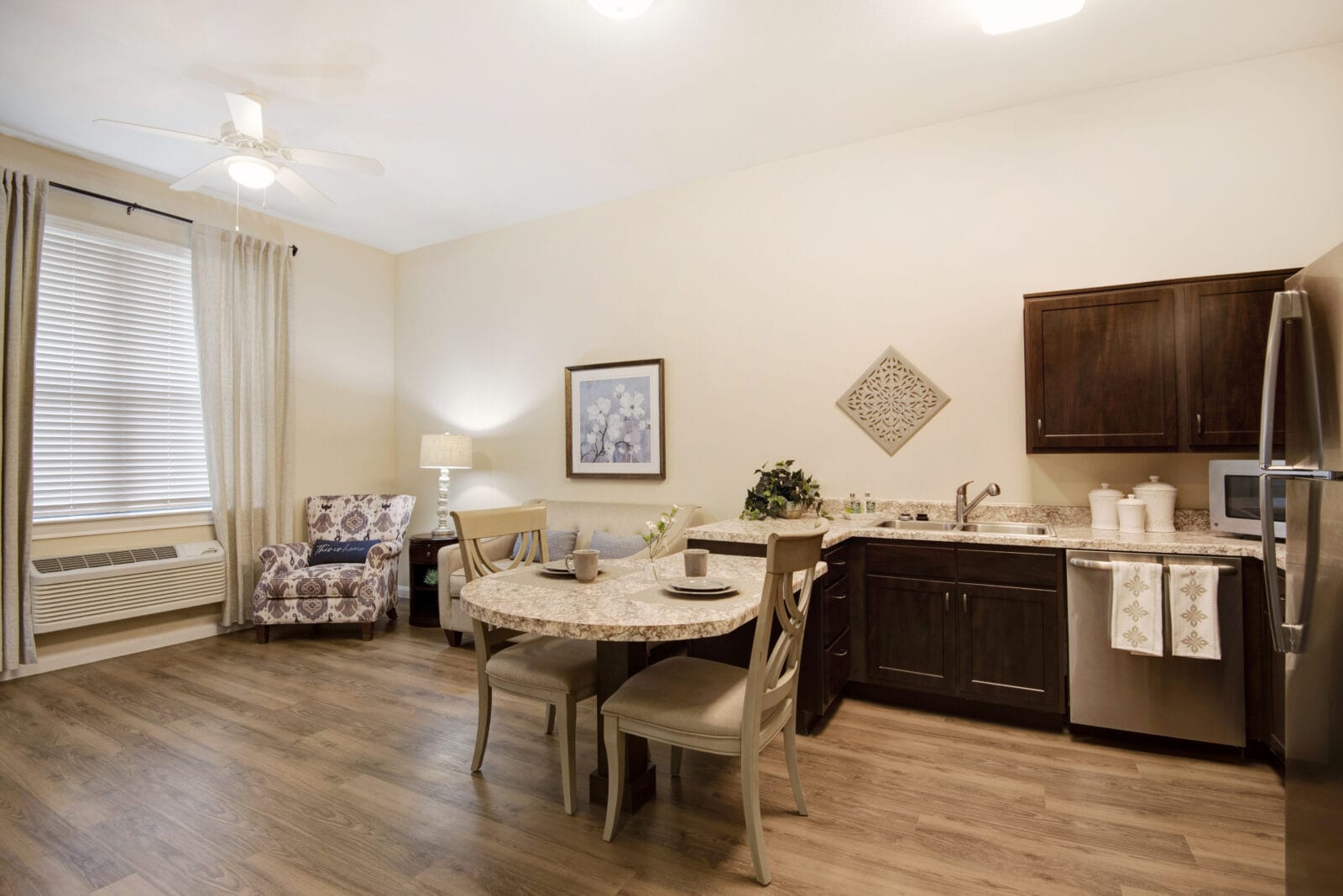 They truly feel like home. The Assisted Living apartments have high ceilings, built-in café tables, and full-size kitchens with refrigerators, microwaves, and dishwashers. Some even include patios for fresh air and quiet mornings. Memory Care studios are private, easy to navigate, and thoughtfully designed with safety and comfort in mind.
